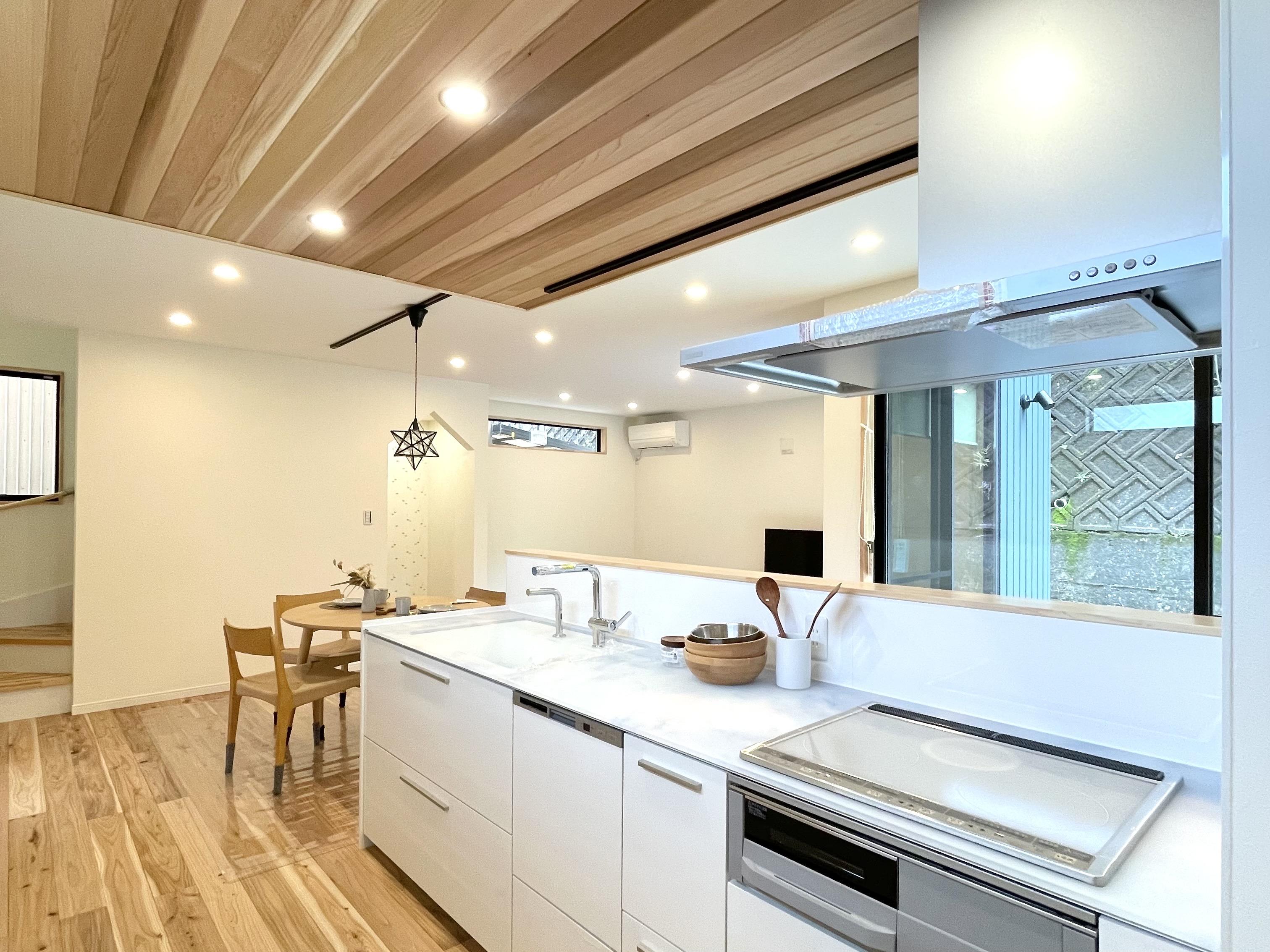 無垢の床が1階から2階まで途切れなく広がります。造作洗面や、スギをあしらったキッチンの下がり天井などなど…
